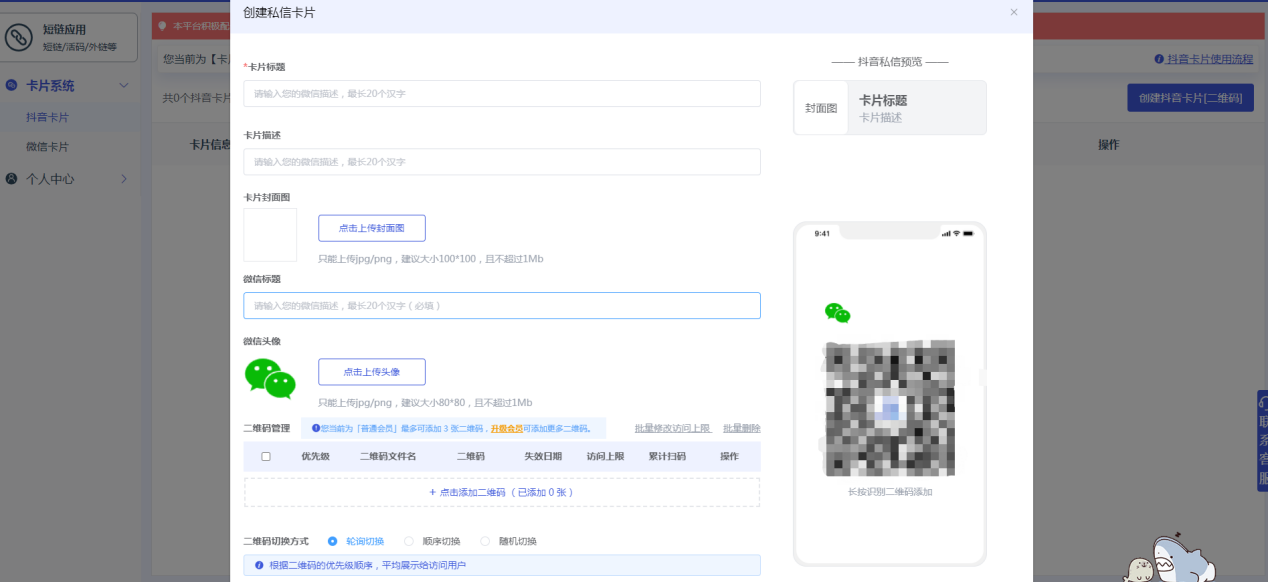 快手/抖音/知乎等app公域流量,可以使用抖音卡片,链接/二维码一键转换为卡片式效果,无风险提示,快速吸粉,通过爱短链后台制作生成抖音私信卡片后,当用户点击卡片后,无任何风险提示直接无缝跳转微信,一键添加个人微信/企业微信号,通过裂变等工具快速加好友。立即免费生成:https://www.aifabu.com/card