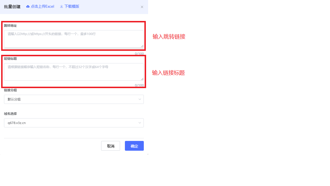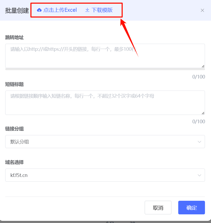 下载模版,按照模版格式,填写好标题和跳转链接后直接上传,后台将自动读取您的文件中的标题和地址