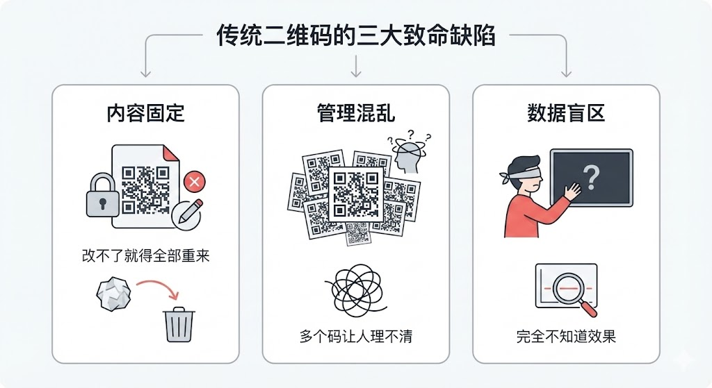静态二维码生成后,跳转内容就被"锁死"了。活动临时调整?重新设计印刷。产品信息更新?之前发出去的物料全部作废。一家连锁餐饮品牌曾因菜单更新,不得不重新印刷1万张桌贴,成本超过2万元。