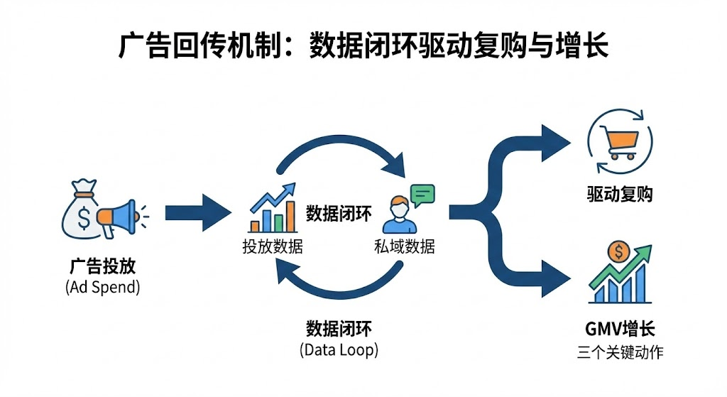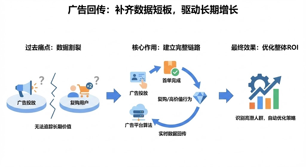 传统广告后台只能告诉你点击率和首单转化,至于用户后续的复购行为,完全是盲区。广告回传机制的出现,相当于给私域运营装上了"数据导航仪"。