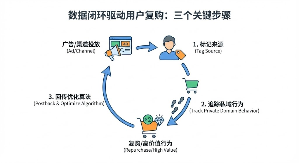 数据闭环不是简单的"记录用户行为",而是让广告投放和私域运营形成互相反哺的增长循环。这个过程可以拆解成三个关键步骤。
