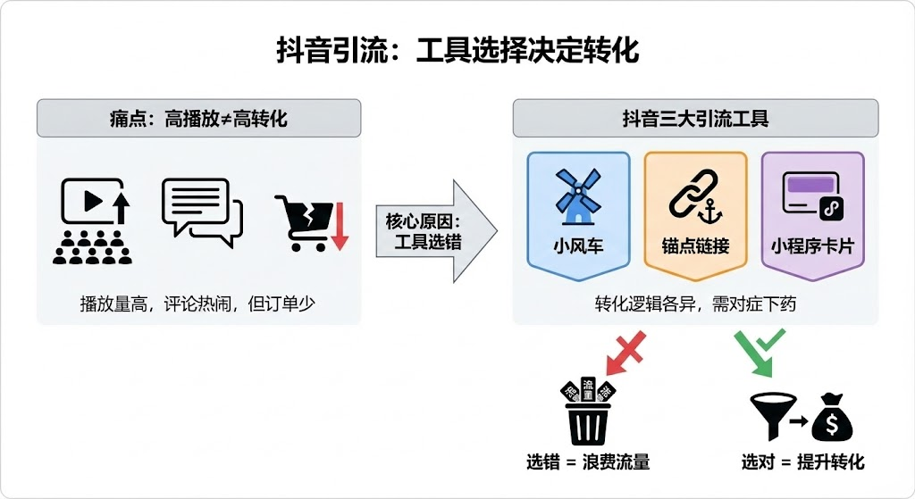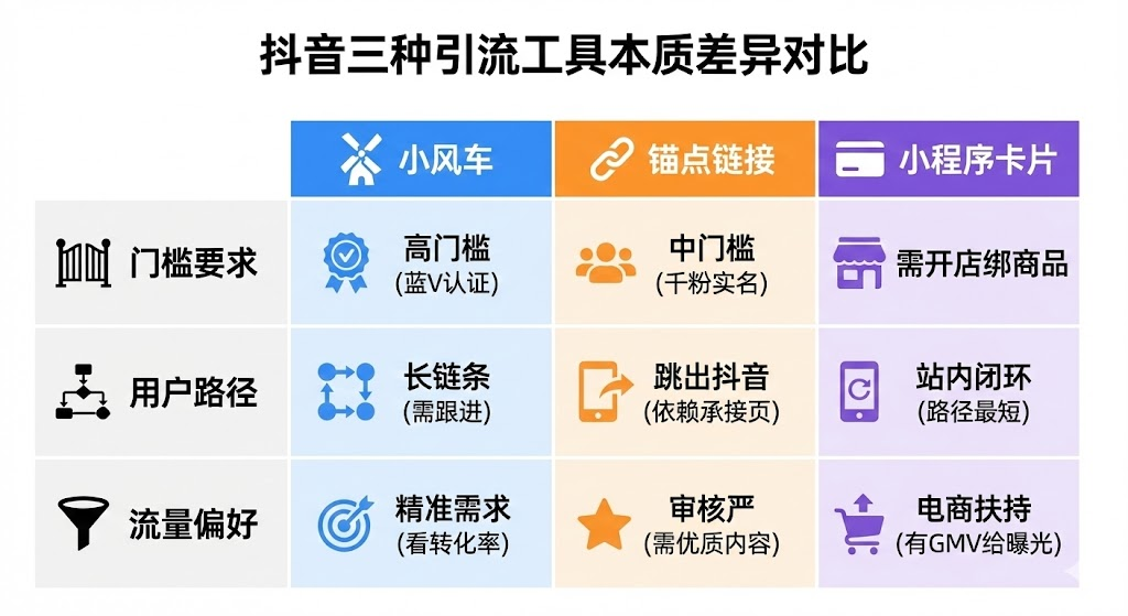 抖音给创作者准备了三套工具:小风车、锚点链接、小程序卡片。表面看都是让用户点击,但背后的转化逻辑完全不同。选错工具,等于把流量白白浪费。