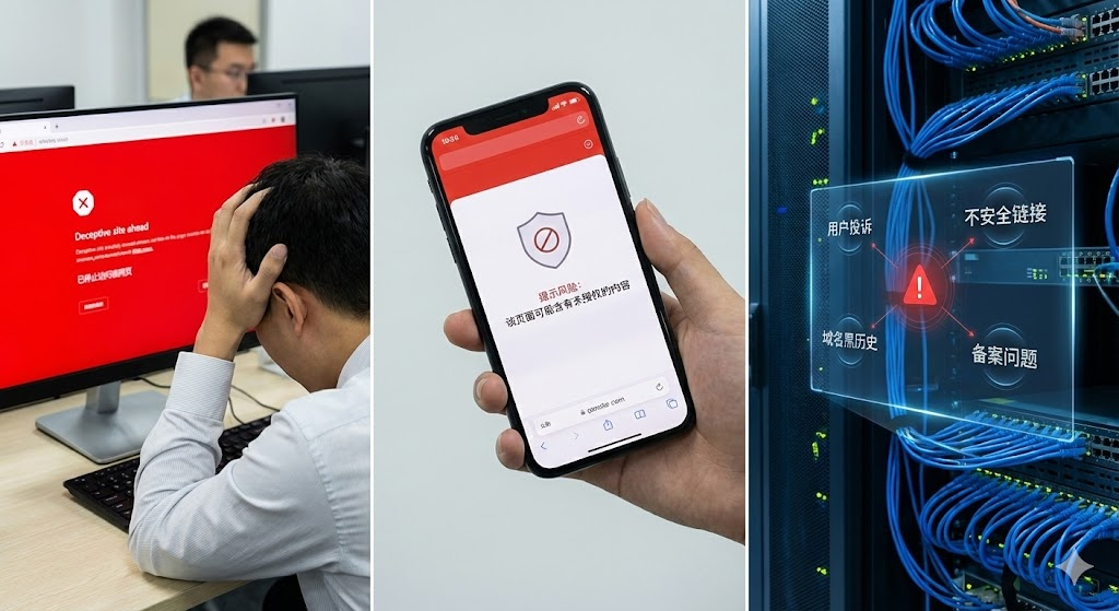 网站突然被浏览器标红拦截,显示"提示风险"或"已停止访问该网页"?这类安全警告可能源于用户投诉、不安全链接、域名黑历史或备案问题。运营网站的人可能都遇到过:用户反馈打不开页面,自己一测试,浏览器弹出红色警告,或者直接显示"已停止访问该网页"。流量瞬间归零,客服电话被打爆。这类安全拦截背后有一套复杂的检测逻辑,搞清楚触发机制,才能对症下药。