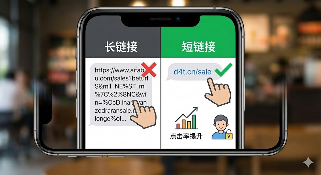 2. 心理层面:短链接通常由品牌域名 简短字符组成,比如"d4t.cn/sale",让用户快速识别来源,降低了疑虑。相比之下,带着一堆参数的长链接缺少人工编辑的温度感