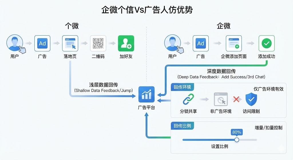 个微加粉通常是二跳:用户点广告→跳到落地页→长按识别二维码→添加好友。这个路径里,你只能回传"点击"或"跳转"这些浅层数据。企微可以做直跳:用户点广告→直接唤起企微添加页面→1步添加成功。回传时机精确到"好友添加成功""第3次开口"这些深度行为。数据颗粒度越细,广告优化空间就越大。