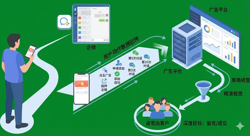 先说个很多人不知道的事:企微加粉的每个动作,都能回传给广告平台。比如用户点击广告、跳转到企微、申请添加好友、添加成功、首次对话、第3次对话、第5次对话,甚至第10次对话——这些节点的数据都可以选择性回传。