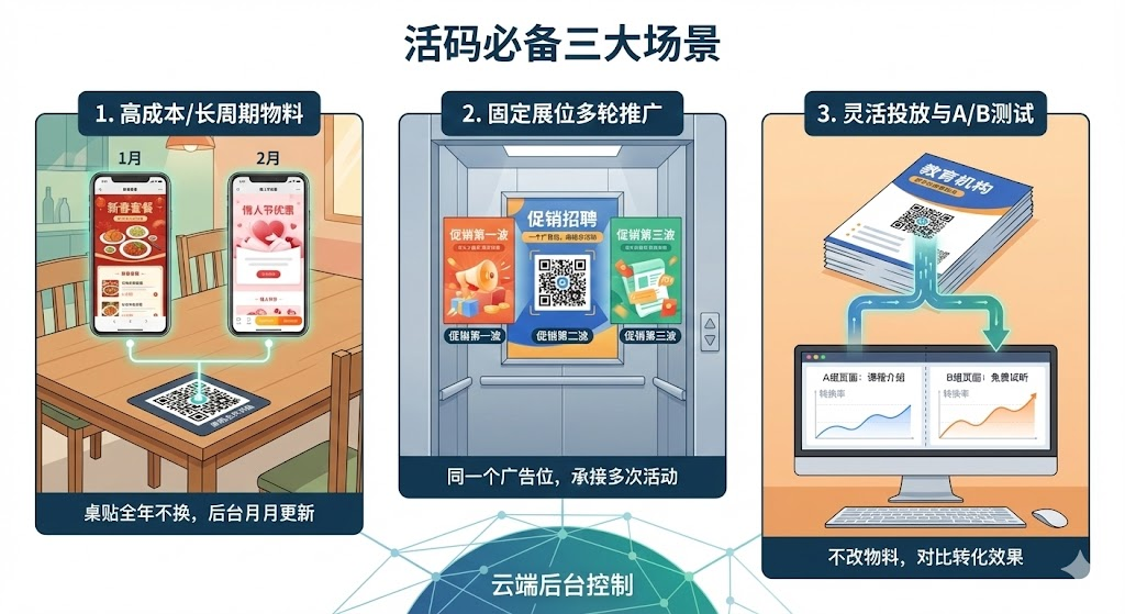 • 同一个推广位置要承接不同活动时,活码能避免重复投入。比如电梯广告位,租期三个月但要做五次促销,用活码就不用每次都换海报。