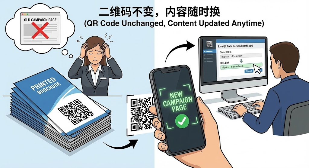 • 这个过程类似快递中转站。包裹上的单号(二维码)不会变,但它对应的收货地址(目标链接)可以在系统里修改。扫码就像查询包裹,系统告诉你当前该去哪里。