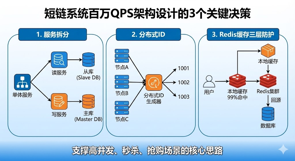 电商大促时短链访问量突然暴增,系统直接挂掉?这不是服务器不够强,而是架构设计没做对。本文从实际业务场景出发,拆解高并发短链系统的核心架构:服务拆分、分布式id、redis缓存三层防护。掌握这套思路,不只是短链,秒杀、抢购等场景都能用上。