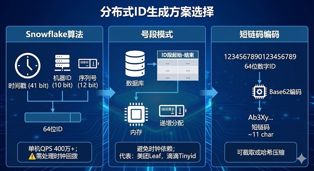 3. 短链码编码:数字id用base62编码转成短链码,64位snowflake id转换后约11个字符,可截取或哈希压缩