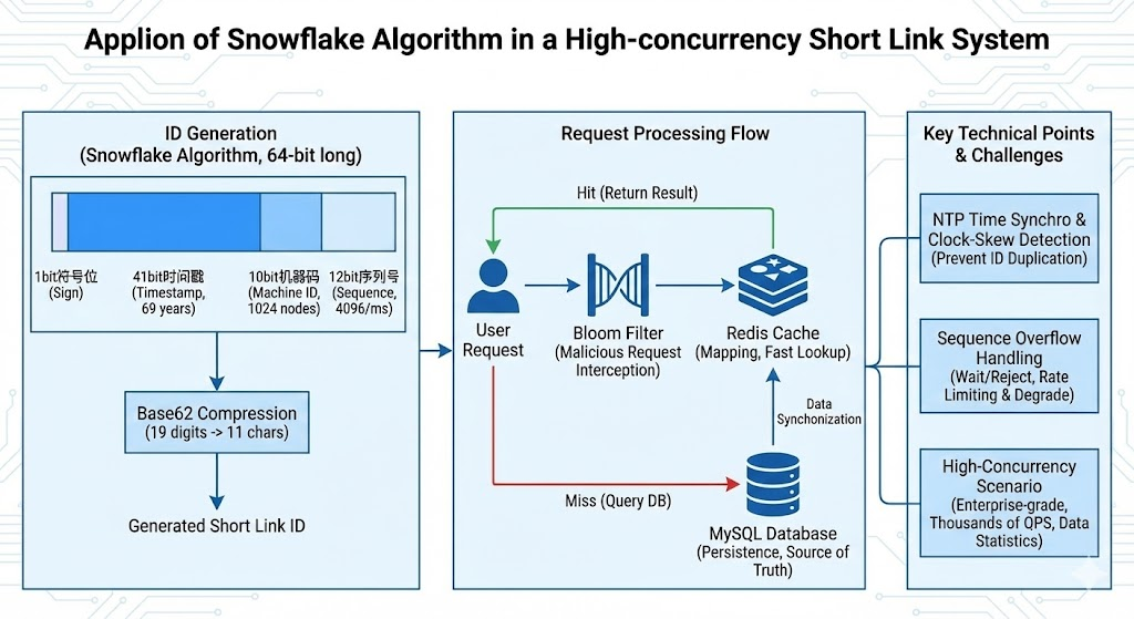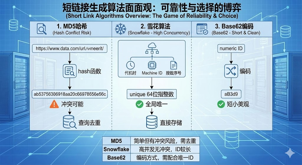 自建短链服务时,算法选择直接影响系统稳定性。做过短链接系统的人都清楚,表面上只是"把长网址变短",背后涉及分布式id生成、哈希冲突处理、高并发存储等一系列挑战。选错算法?轻则链接重复,重则整个系统瘫痪。微博、抖音每天处理数亿次短链跳转,它们用的是什么方案?如果你的团队要自建服务,该怎么选?