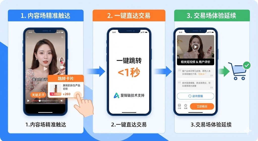 其次是一键直达交易场景。点击卡片直接跳转到商品详情页,不用退出视频,不用打开其他app,不用重新搜索。整个跳转过程不到1秒,用户的注意力和购买冲动都被完整保留。这个"一键直达"需要打通内容平台和电商系统的数据接口,爱短链提供的跳转卡片功能能生成平台认可的跳转链接,支持跳转到小程序、公众号、外部链接等多种场景。