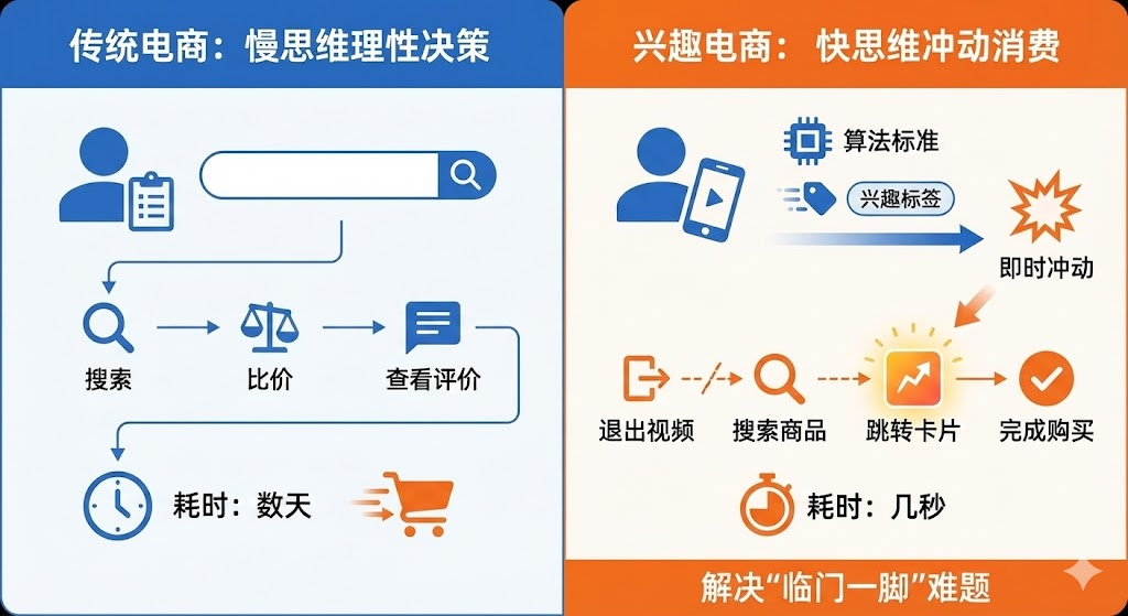 传统电商是慢思维决策模式。用户带着明确的购物清单,通过搜索、比价、查看评价等理性流程,可能花费数天时间完成购买。这个过程中,商家依靠搜索排名和关键词广告获取流量,用户的每一步都很理性。