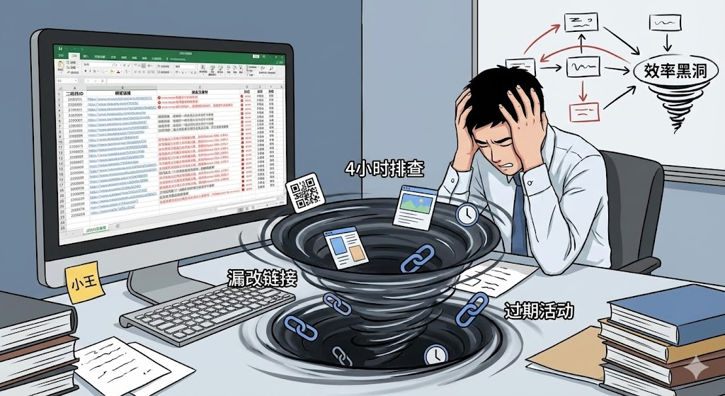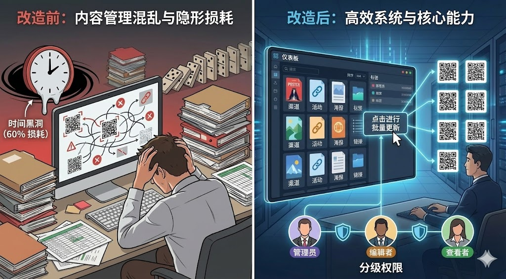 活码系统不只是生成二维码,更是动态内容分发中枢。当活码数量突破100个,没有内容管理能力的团队会陷入"改一个链接查几十个码"的困境。某电商团队用活码做渠道推广,200个活码对应50套落地页素材,运营小王花了4小时逐个排查活码绑定的链接,结果还是漏改了3个,导致部分用户扫码后看到过期活动。问题的核心不是工具不好用,而是缺少内容管理能力。