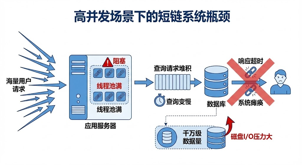 短链服务面临高并发时,数据库查询慢、请求堆积会严重影响用户体验。转转短链平台在业务增长过程中,遇到过数据库查询变慢、服务器响应超时的问题。当短链生成量激增时,每次用户点击短链都需要查询数据库,找到对应的原始长链接。单表数据量达到千万级后,即使建立了索引,查询速度也会明显下降。数据库的连接数有限,当并发请求超过连接池上限时,新请求只能排队等待,响应时间越来越长。