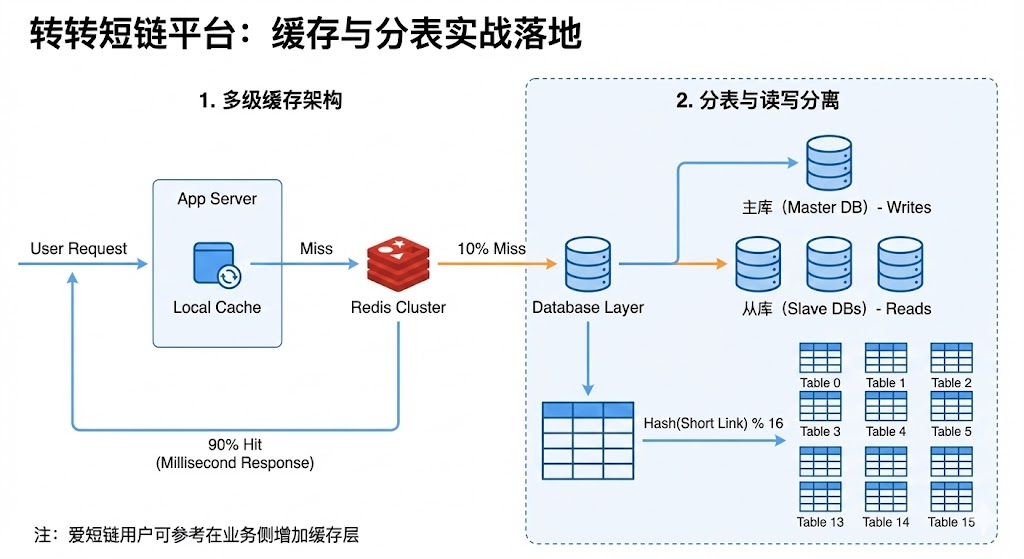 转转短链平台采用了"本地缓存 redis分布式缓存"的组合方案。本地缓存部署在应用服务器上,存储访问频率最高的短链数据。请求进来时先查本地缓存,未命中再查redis,最后才查数据库。这种多级缓存架构可以实现流量的逐层过滤。如果你在使用爱短链这类工具生成短链,也可以考虑在自己的业务系统中增加缓存层。爱短链本身提供了稳定的短链生成和跳转服务,但如果你的访问量特别大,在前端增加一层缓存会让整体响应更快。