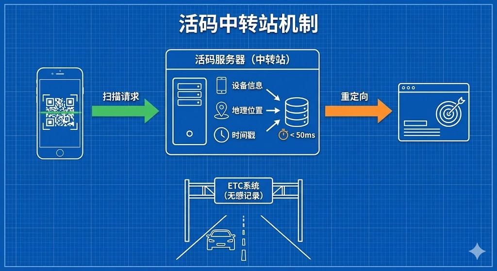 活码在二维码中嵌入的不是最终网址,而是一个带有唯一标识的中转链接。用户扫描时,请求会先发送到活码服务器,服务器在50毫秒内完成三件事:记录本次扫描的设备信息、地理位置、时间戳,然后把用户重定向到真正的目标页面。这个过程就像高速公路的etc系统。车辆经过时,闸机自动识别车牌、记录通行时间、扣费,但车速完全不受影响。用户感觉不到任何延迟,但每一次扫描都已经被系统完整记录下来。