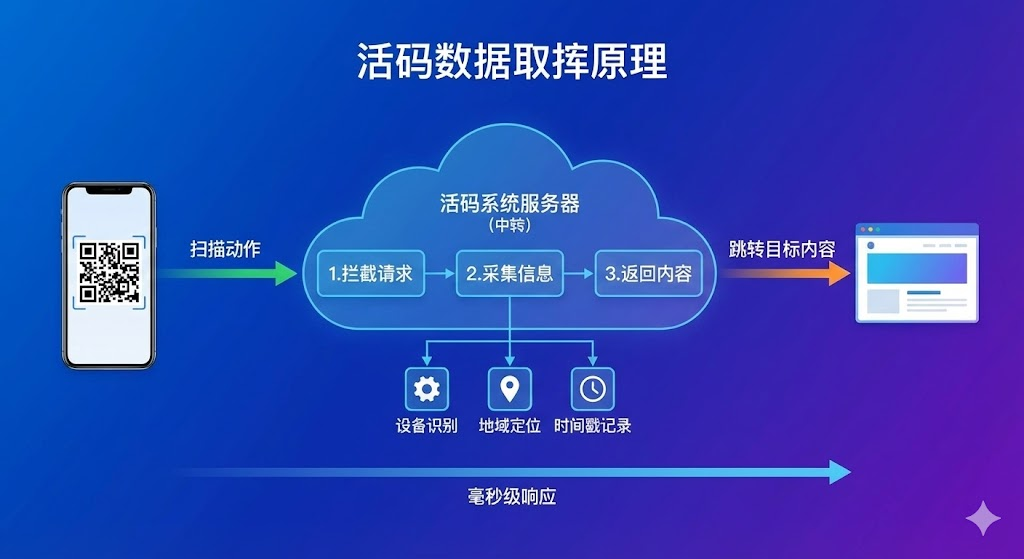 很多人用活码统计扫码数据,但很少有人真正理解:用户拿手机扫一下,后台的数字是怎么跳动的?这个过程看似简单,背后却藏着一套完整的数据采集链路。搞清楚这套逻辑,你就能明白为什么有些数据能统计,有些统计不了;为什么同样是二维码,活码能做到实时分析,普通码却只能"哑巴"。