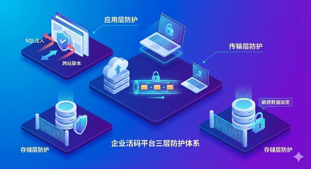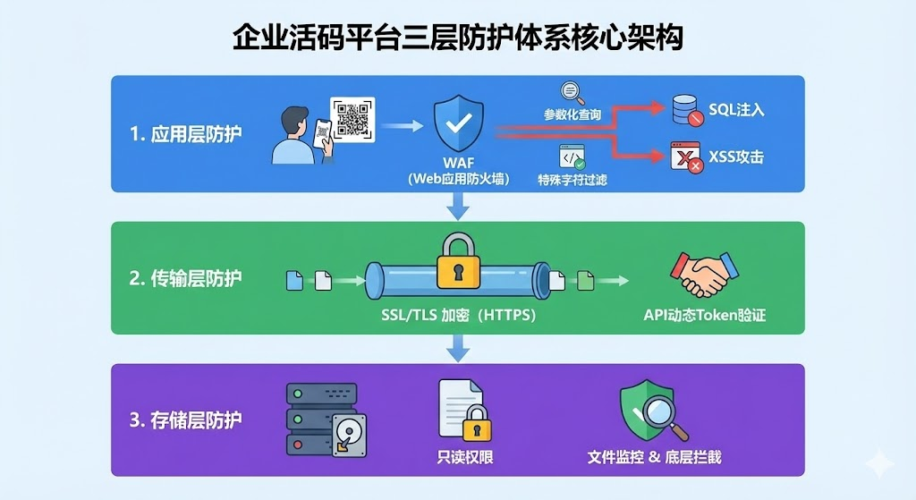 企业活码平台承载着客户数据和营销转化的核心链路,一旦遭遇攻击可能导致数据泄露或流量劫持。当日均扫码量突破10万次,或涉及支付跳转、客户信息采集等敏感场景时,安全防护就成了必选项。黑客通过sql注入窃取用户数据、利用跨站脚本植入恶意代码,甚至直接篡改二维码跳转链接的案例屡见不鲜。从访问入口到数据存储,企业需要建立全链路的防护机制,构建应用层、传输层、存储层三个维度的完整防护体系。