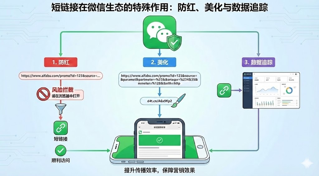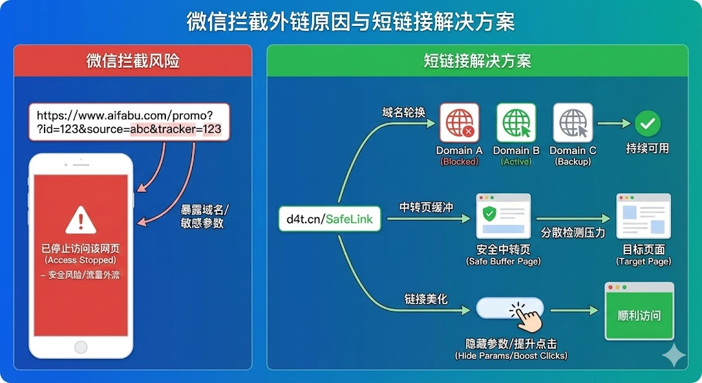 微信对外链管控越来越严,很多运营人员发现推广链接经常被拦截或标红。短链接不只是缩短网址那么简单,它通过域名轮换、中转页设计等技术手段,能有效规避微信的风险检测,同时美化链接外观、追踪传播数据。在微信里发过推广链接的人,多半遇到过"这个网址可能存在安全风险"的提示,或者朋友圈点击量很高但实际访问量却少得可怜。长链接因为包含明显的域名特征和参数信息,很容易被系统识别并拦截,而短链接通过技术处理,能在一定程度上绕过这些限制,还能解决链接美观度、数据统计、灵活修改等一系列实际问题。