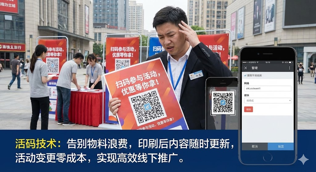 这种情况在线下推广中太常见了。传统二维码一旦印刷,内容就彻底锁死。活动改期、链接失效、产品下架,任何变动都可能让整批物料报废。活码技术的出现彻底改变了这个困局——同一个二维码,扫出来的内容可以在后台随时替换,让印刷物料真正实现"一次投入,长期复用"。