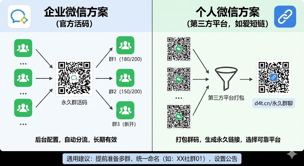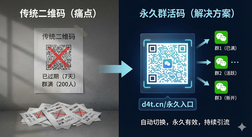 微信群二维码默认7天就失效,群满200人后新人扫码也进不来。这让很多运营者头疼不已,尤其是已经印刷在海报、传单上的二维码。运营社群时,最让人崩溃的莫过于刚把二维码发到各个渠道,没几天就提示"该群二维码已过期"。更糟糕的是,当你好不容易积累到200人,新用户扫码却显示"群聊人数已满"。这些问题不仅浪费推广成本,还会流失大量潜在用户。