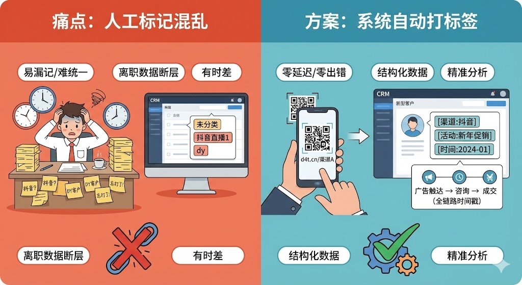 • 员工离职或调岗后,新员工接手时发现大量客户没有标签,只能通过聊天记录反推来源,这种补救工作不仅耗时,准确率也大打折扣