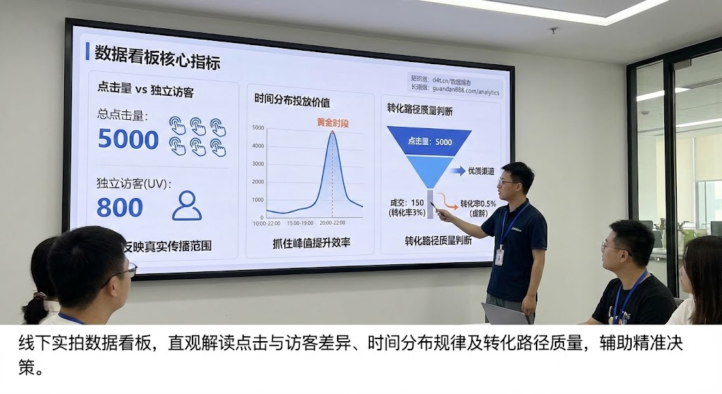 • 点击量统计的是所有点击次数,同一个人反复点击会累计。独立访客才是真实触达的人数,这个数字更能反映传播范围。点击量5000但独立访客只有800,说明大部分点击来自重复访问,可能是老客户在反复查看,也可能是某些渠道的流量质量不高。