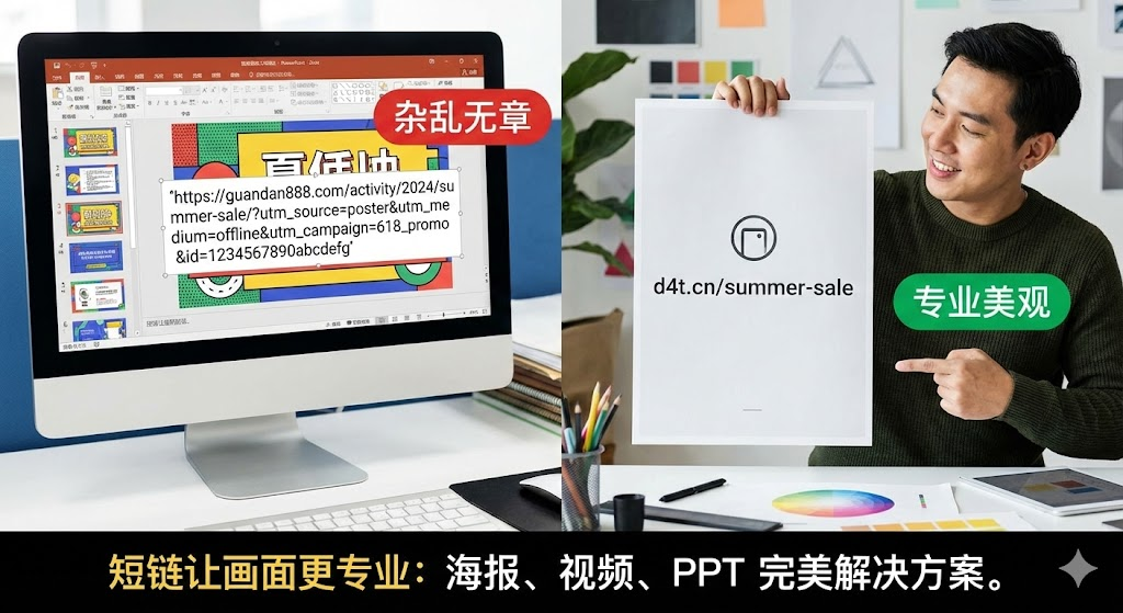 设计海报、制作视频或ppt时,长网址会让画面显得杂乱无章。短链接能把几十个字符的网址压缩到10个字符以内,既保持视觉简洁,又能通过数据追踪了解用户行为。设计活动海报时,那串带着一堆参数的长网址直接破坏了整体美感,ppt演示和视频制作也面临同样问题,观众看到冗长的网址会下意识觉得不够专业。短链接不仅能让画面更干净,还能在后台记录每一次点击数据,帮你判断哪个渠道的传播效果更好。