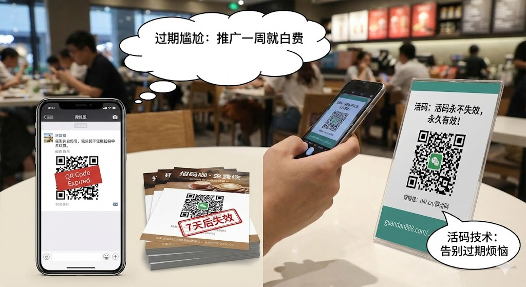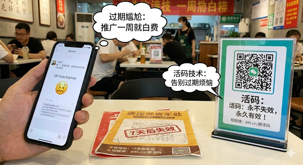 微信官方把群二维码有效期设为7天,本意是防止恶意传播。但对正常推广来说,这限制确实麻烦。朋友圈置顶的推广内容,一周后自动失效。公众号文章里嵌入的群二维码,时间一长就成了摆设。印在宣传单页、海报上的二维码更尴尬,印刷成本花出去了,却只能用7天。