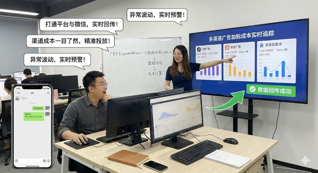 投信息流广告加粉,花了几万块却不知道单个粉丝多少钱?核心问题在于缺少数据回传机制。不少中小企业主遇到过这种情况:在抖音、快手投了几轮信息流广告,后台曝光量看着挺漂亮,但加了多少粉丝、每个粉丝花了多少钱,完全算不明白。月底对账时只能看到总花费和微信新增人数,中间的转化路径就像黑箱,想优化投放根本无从下手。本文从成本统计难点出发,讲解如何通过广告平台的数据回传功能,实时追踪抖音、快手、百度等渠道的加粉成本,让每一笔广告费都有据可查。