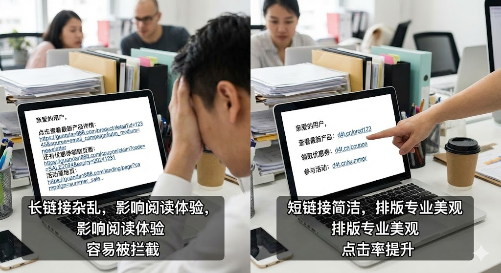 带追踪参数的电商链接,往往包含商品id、渠道来源、用户标识等信息,整个url能达到80-120个字符。在邮件正文里插入3-5个这样的链接,整段文字就被切割得支离破碎。收件人打开邮件,第一眼看到的不是精心设计的文案,而是一堆看不懂的字母数字组合。这种视觉冲击会让人下意识觉得"这是群发的营销邮件",直接降低信任度。