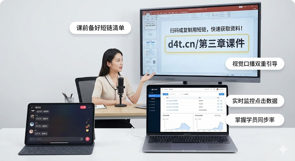 大班直播课中,学员人数多、互动频率低,短链接主要用于单向资料分发。开课前把所有短链接做成一张图片,直播开始时置顶在聊天区。学员随时可以回看这张图,不用担心信息被刷屏淹没。课后把这张图发到学员群,方便复习和传播。
