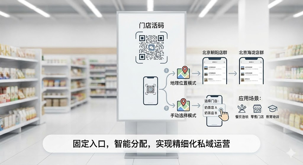 门店活码技术解决了这个难题——顾客扫描同一个二维码,系统根据地理位置或选择标签,自动跳转到对应门店的会员群,真正实现一码多用。本文将详细讲解门店活码的工作原理、具体设置方法以及提升入群率的实战技巧。