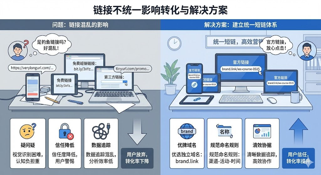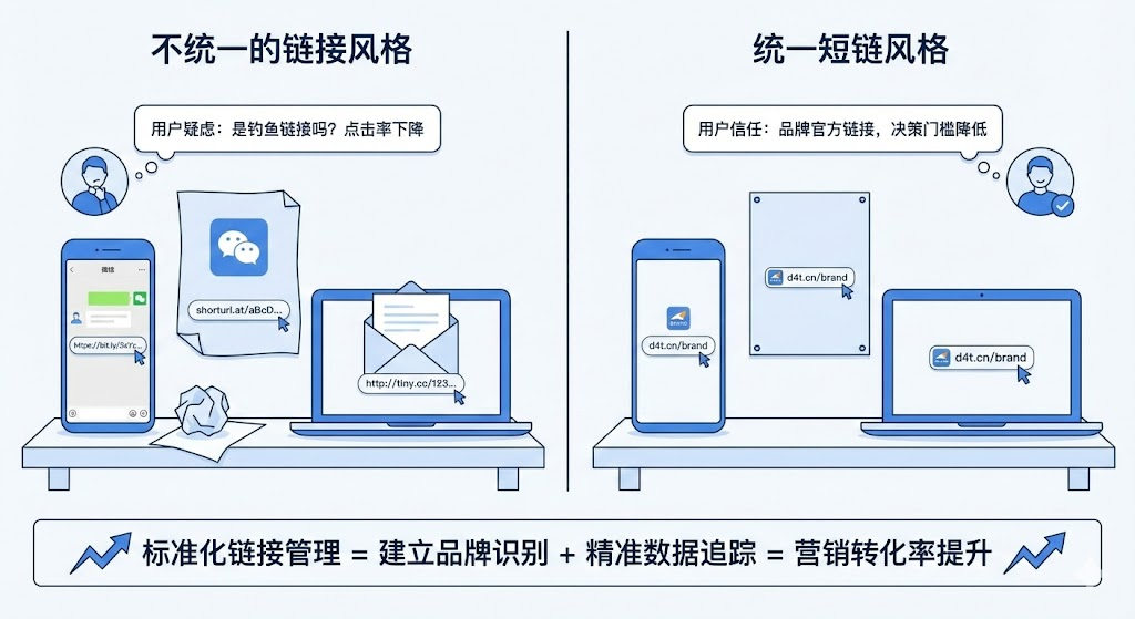 做过多渠道推广的运营都遇到过这种尴尬:微信群里发的链接是一个样式,朋友圈海报上又换了另一种,邮件里还有第三个版本。用户看到这些不同的链接,第一反应往往是犹豫——这会不会是钓鱼链接?这种不一致带来的信任成本,直接体现在点击率和转化率的下降上。