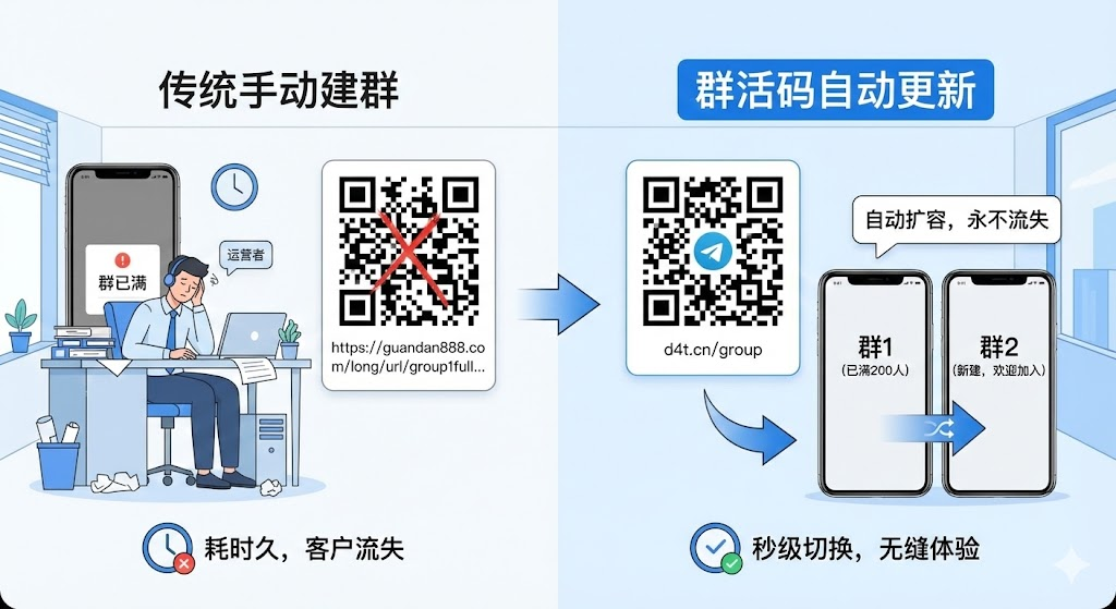 运营企业微信社群时,200人的群容量限制是个绕不开的问题。传统做法是群满后手动创建新群,再把新二维码替换到各个推广渠道,这个过程往往需要半小时甚至更久。深夜或周末群满了怎么办?客户扫码进不来,直接就流失了。群活码改变了这个局面,它的工作逻辑是预先关联多个群,当第一个群达到200人上限时,系统自动把后续扫码的客户分配到第二个群,整个切换过程在后台完成,客户感知不到任何变化。