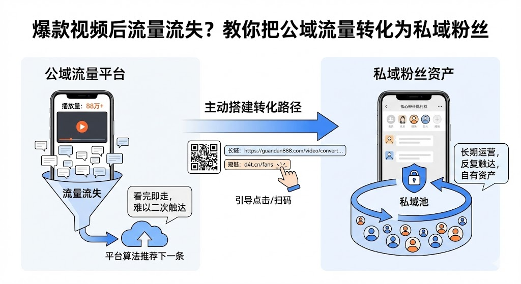 视频播放量破百万,但用户看完就走,无法二次触达?公域流量的归属权在平台手里,创作者需要主动设计引流动作。只有搭建完整的转化路径,才能把平台的流量真正变成自己的资产,实现从公域到私域的有效转化。