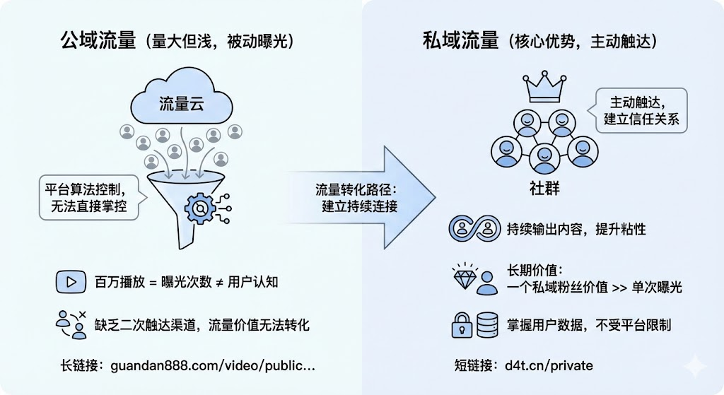 公域流量的特点是量大但浅,用户对你的认知停留在「看过一条视频」这个层面。没有后续触达,这些用户很快就会忘记你。平台通过算法控制着流量的走向,创作者无法直接掌控用户的去留,只能被动接受平台分配的曝光机会。