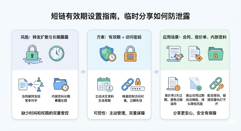 微信文件过期是被动清理,主动设置短链有效期,能让你自己决定资料的生命周期。配合访问密码使用,即便链接泄露,没有密码的人也打不开,这种可控性正是临时分享场景最需要的安全保障。本文从实际场景出发,讲解如何配置短链有效期,以及密码保护的正确用法,帮助你在分享合同、报价单等敏感文件时更安心。