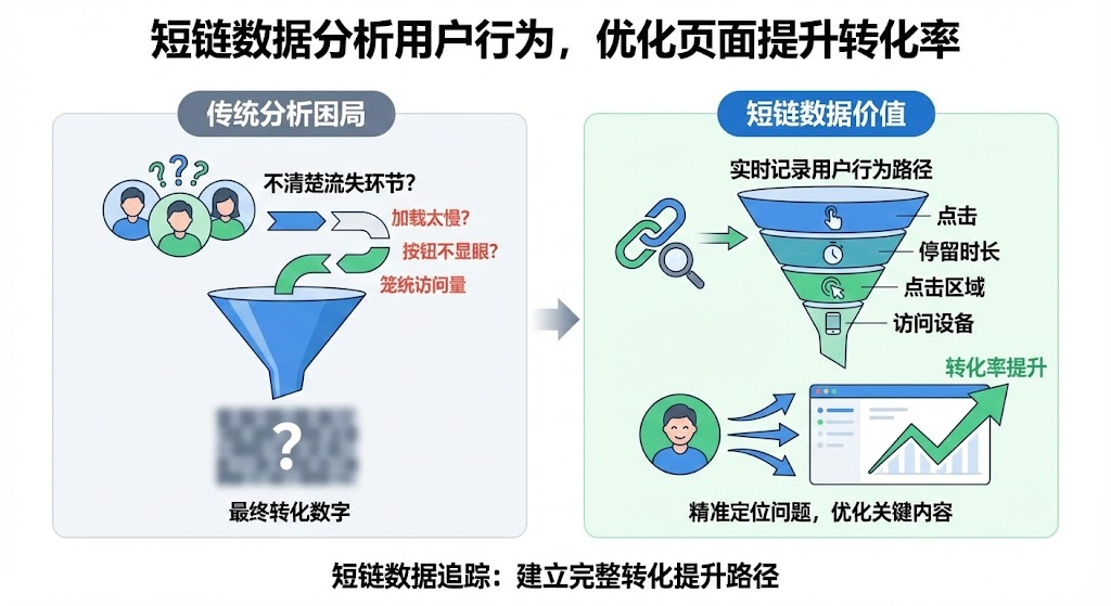 短链数据不只记录点击次数,它能捕捉用户从看到链接、点击进入、浏览页面到最终转化的全过程。多少人点了链接但没完成注册?多少人在支付页面停留后离开?这种完整的行为链条,帮你快速定位流失环节。
