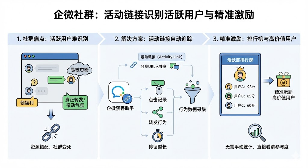 社群运营中最难的是找到真正活跃的成员。社群里总有一批人从不说话,福利倒是领得最快,真正转发内容、带动气氛的成员反而容易被忽略。这种资源错配会让核心用户流失,社群慢慢变死。企微获客助手提供的活动链接能自动追踪成员行为,记录每个成员的点击、转发、停留时长等行为数据,系统自动生成活跃度排行,帮运营者把激励资源投给高价值用户,让运营者不用手动统计就能直接看清谁在真正参与。