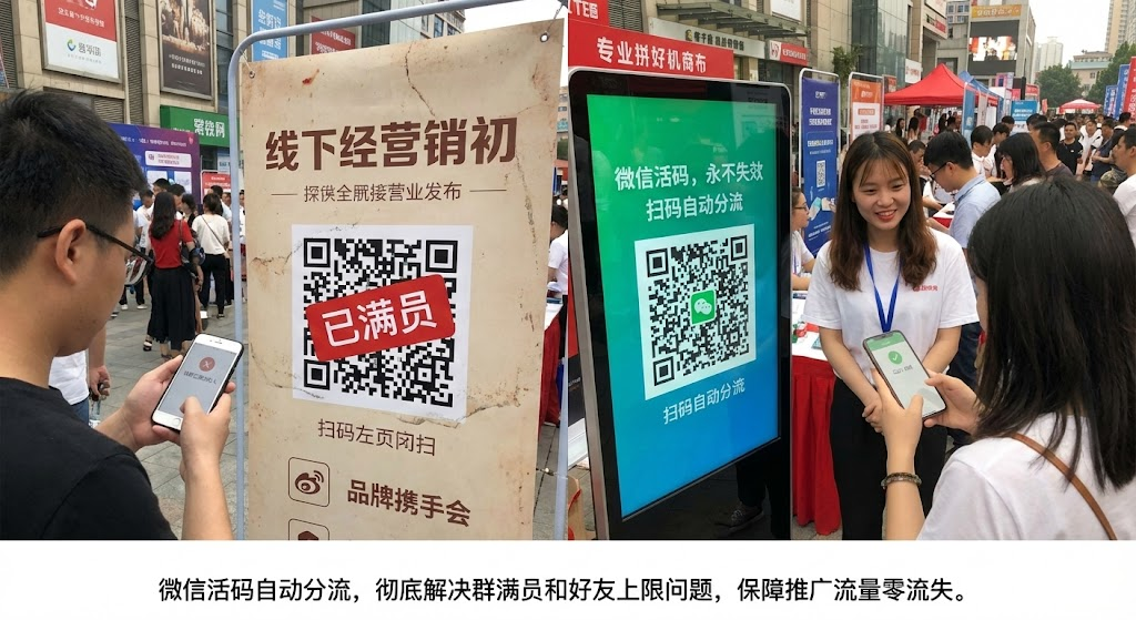 做推广最怕什么?客户扫码后提示「该群已满200人」或「对方好友已达上限」,白白流失精准流量。固定二维码引流存在致命缺陷:一个码只能对应一个群或微信号,满了就彻底失效。数据显示,一场活动因二维码失效流失30%客户的情况并不少见。微信活码通过一个二维码自动切换多个群或微信号,让客户扫码时自动分流到未满的账号,后台随时替换二维码,推广物料完全不用重做,彻底解决客户流失问题。