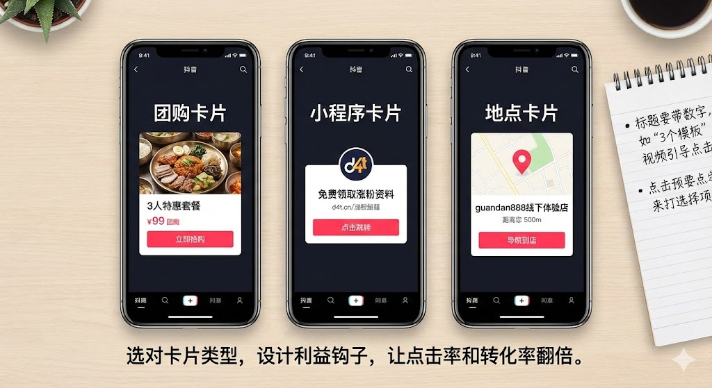 设计钩子文案要直接说利益,别写"点击了解更多"这种废话。卡片标题限15字,前5个字决定点击率。测试发现,带数字的点击率高40%,比如"3个模板""7天见效"这类表达更吸引人。视频内容要与卡片强绑定,让卡片成为剧情的一部分。你讲"3个涨粉技巧",视频只讲2个,第3个引导"左下角卡片有完整版"。或者美食探店视频,拍到招牌菜时口播"这道菜现在有团购价,卡片直接抢"。
