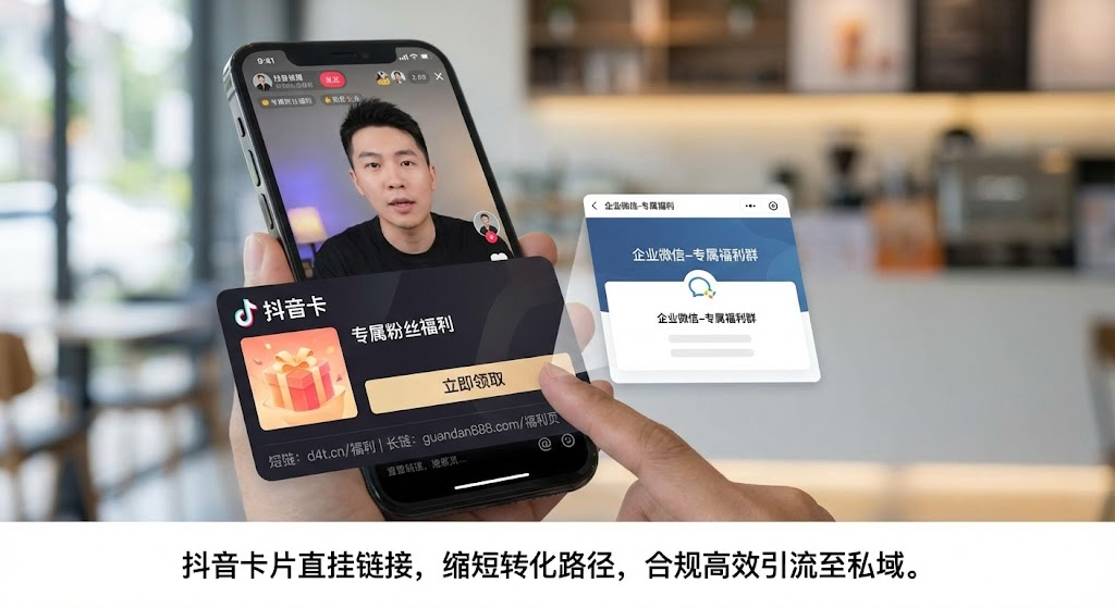 做抖音最头疼什么?评论区引导加微信容易被限流,j9国际官网主页挂链接转化率低得可怜。很多创作者辛苦做内容,却卡在"最后一公里"——用户看完视频就走了,根本进不了私域。抖音卡片是官方认可的合规引流工具,能在视频中直接挂载跳转链接,让用户一点就能到你的小程序、企业号、表单页,转化路径缩短一半。