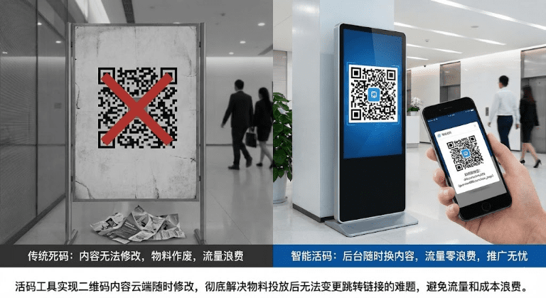 活码工具能让二维码内容随时修改,解决物料已投放但需换链接的难题。做活动推广最怕二维码印出来就改不了,海报贴满全城、社群发了几百个,突然要换落地页或加新客服号只能眼睁睁看着流量白白浪费。活码就是"能改内容的二维码",码的样子不变,扫码后跳转的页面、客服号、小程序可以随时在后台换,让你的推广物料有"后悔药"吃。