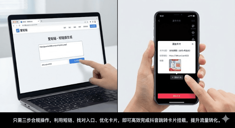 挂载抖音卡片的本质是「合规短链 吸引标题 清晰封面」的组合。整个流程分为三个核心步骤:生成短链接、找到挂载入口、填写卡片信息。按流程操作,90%的人第一次就能过审。