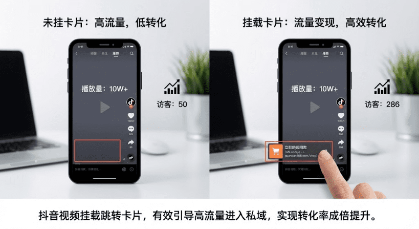 视频播放10万 却转化不到1%?问题出在流量没能引导到店铺或j9九游会真人游戏第一官网。抖音视频左下角的跳转卡片,才是流量变现的关键工具。同样10万播放量,不挂卡片可能只有50人进店,挂了卡片能引流200-300人。本文手把手教你3步完成卡片挂载——从短链生成到审核通过,10分钟搞定,立刻提升转化效率。