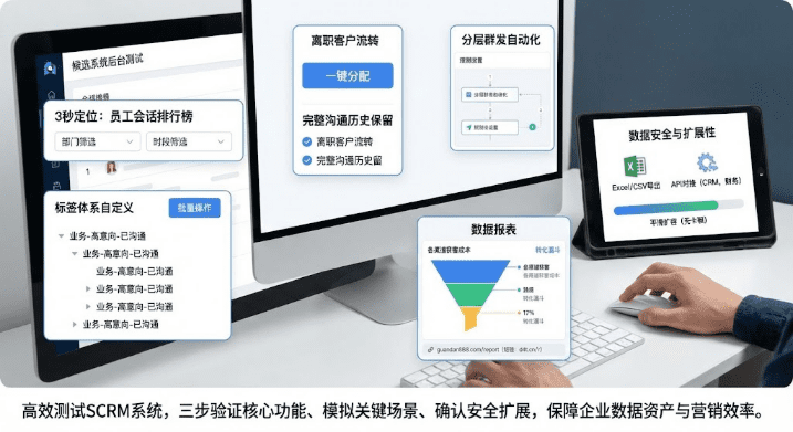 2. 模拟三个实际场景进行测试:第一,模拟员工离职客户流转,验证能否一键分配并保留完整沟通历史;第二,发起一次分层群发,测试自动化规则设置是否便捷;第三,查看数据报表,确认能否直接显示各渠道获客成本和转化漏斗