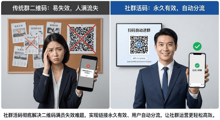 微信的硬性限制让运营苦不堪言,群满200人后二维码直接失效。你发出去的海报、文章里的二维码全部变成废码,用户扫了看到"该群聊人数已满"转身就走,连挽回的机会都没有。