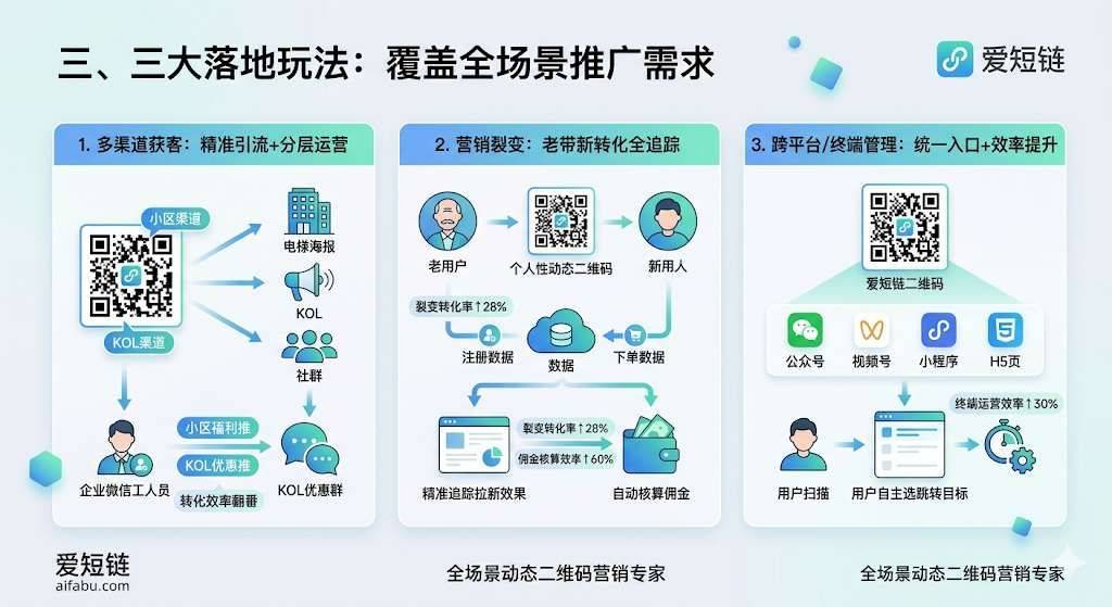 把公众号、视频号、小程序等多平台内容,用爱短链整合成一个统一二维码,用户扫码可自主选跳转目标,不用做多种物料。 某连锁超市用这套方案后,终端运营效率直接提升30%。